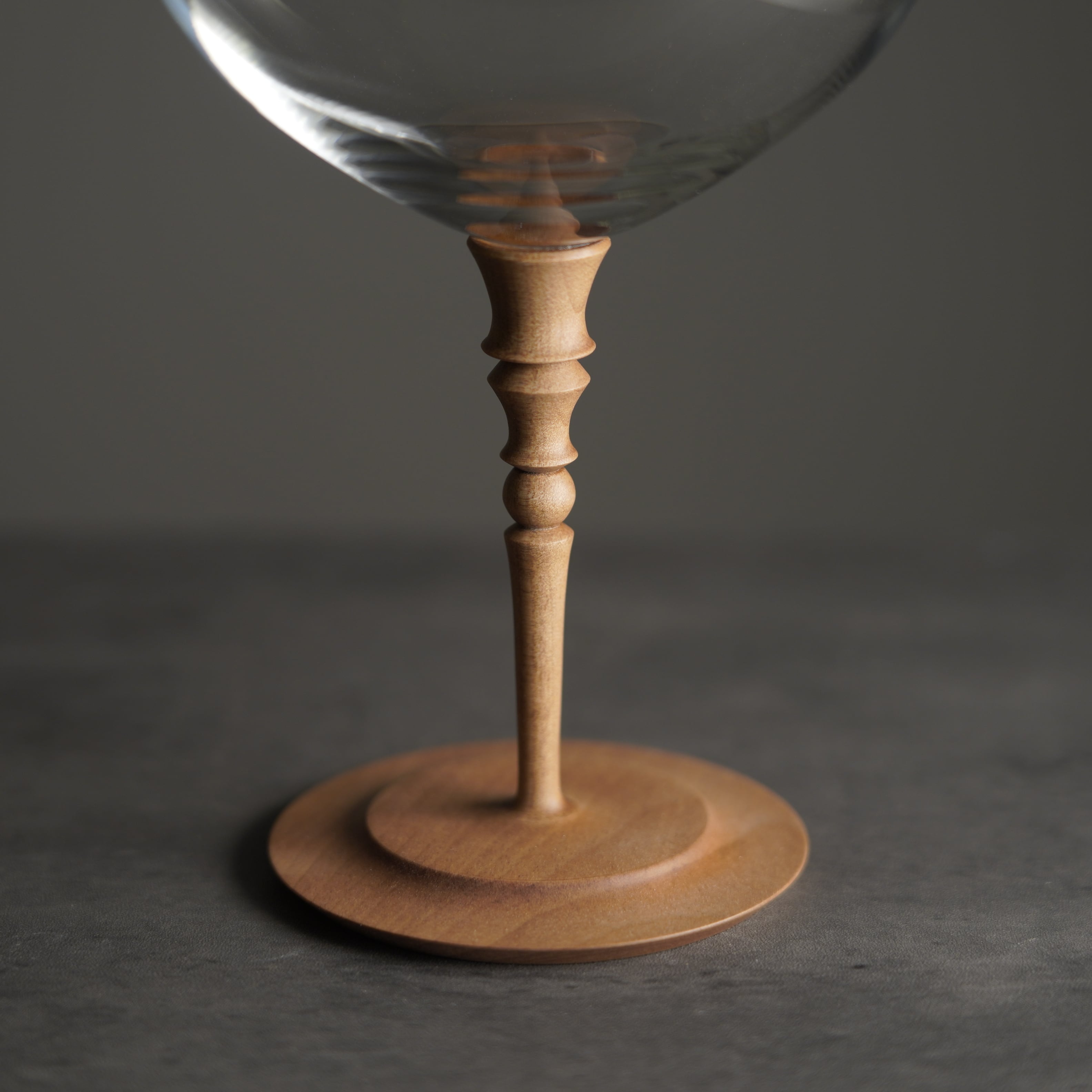 職人の手によって一つ一つ丁寧に削り出された木製の持ち手は、滑りにくく安定して持てるよう設計されている、硝子の美しさと木の温もりを兼ね備えたデザイングラスです。