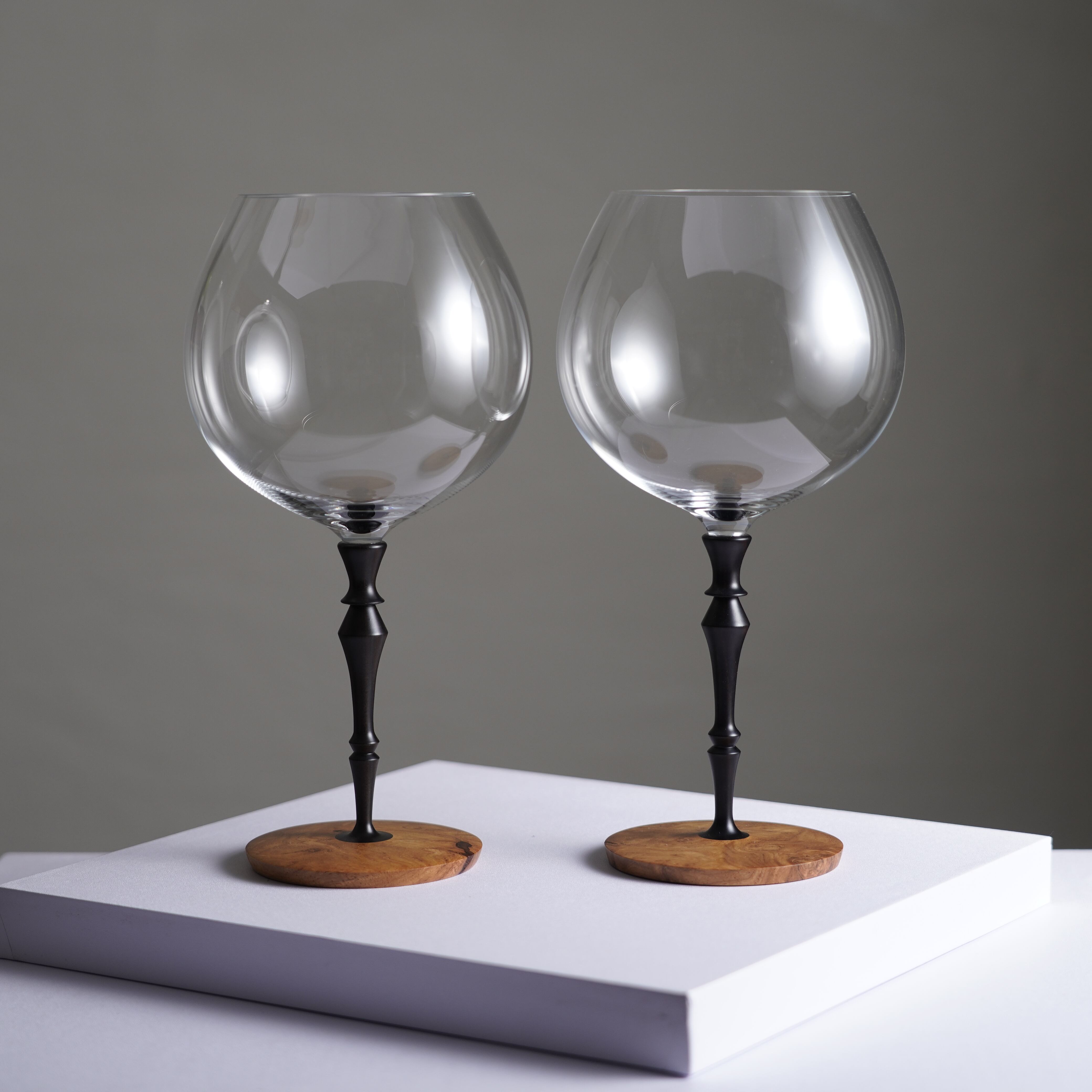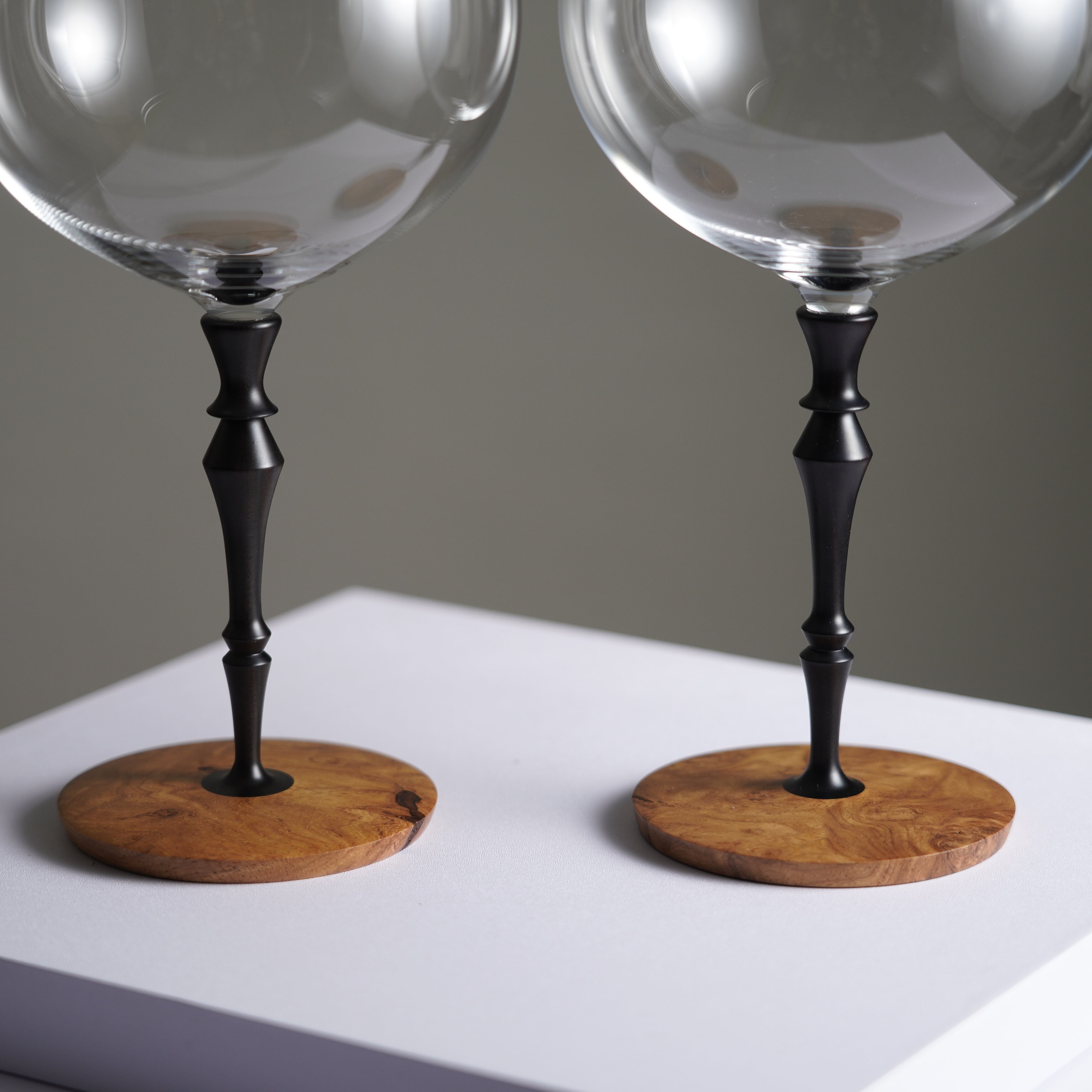 木と硝子の沐器『MOKU glass』の最大の特徴は、持ち手の部分(ステム)と土台(プレート)が木製であることです。