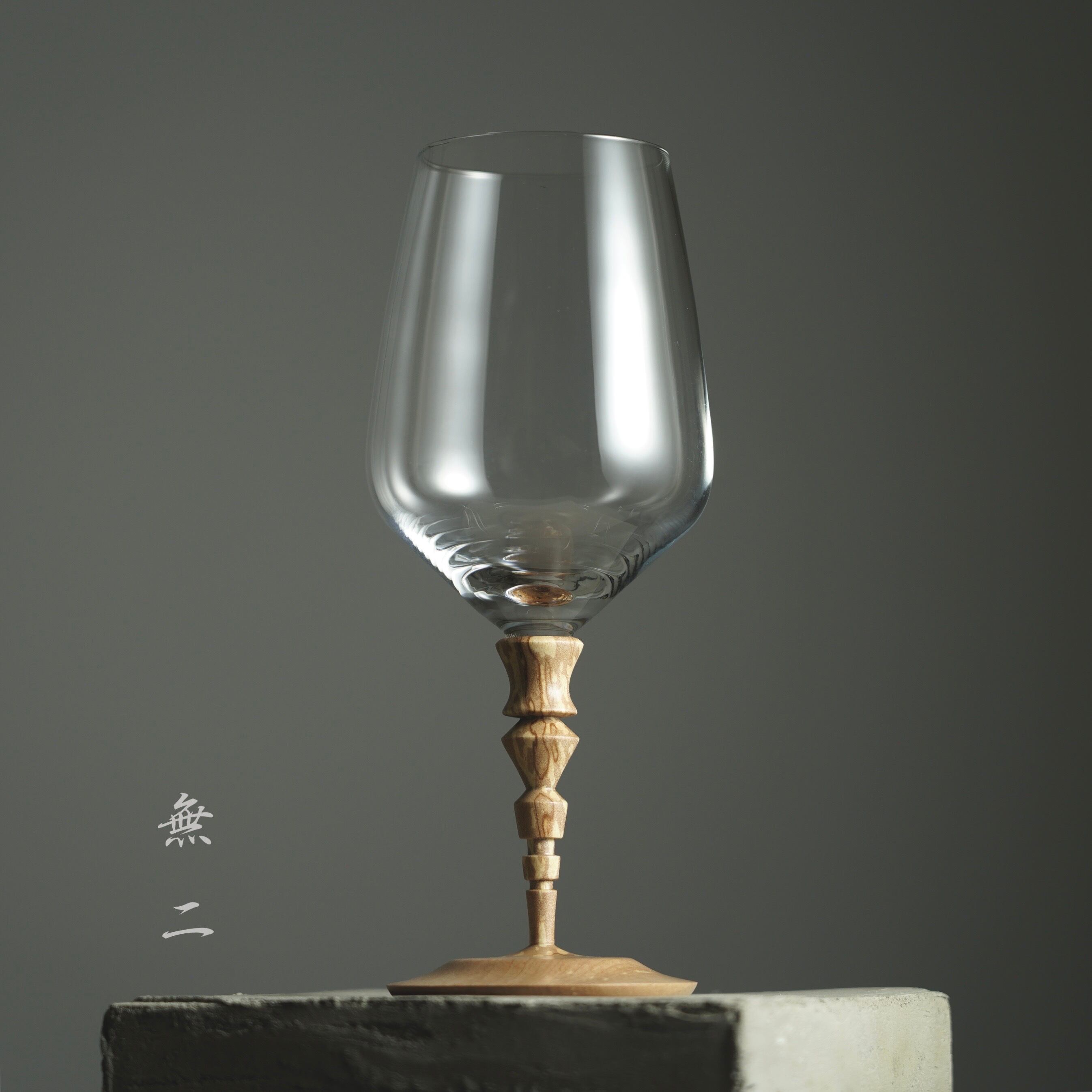 木と硝子の沐器『MOKU glass』の最大の特徴は、持ち手の部分(ステム)と土台(プレート)が木製であることです。