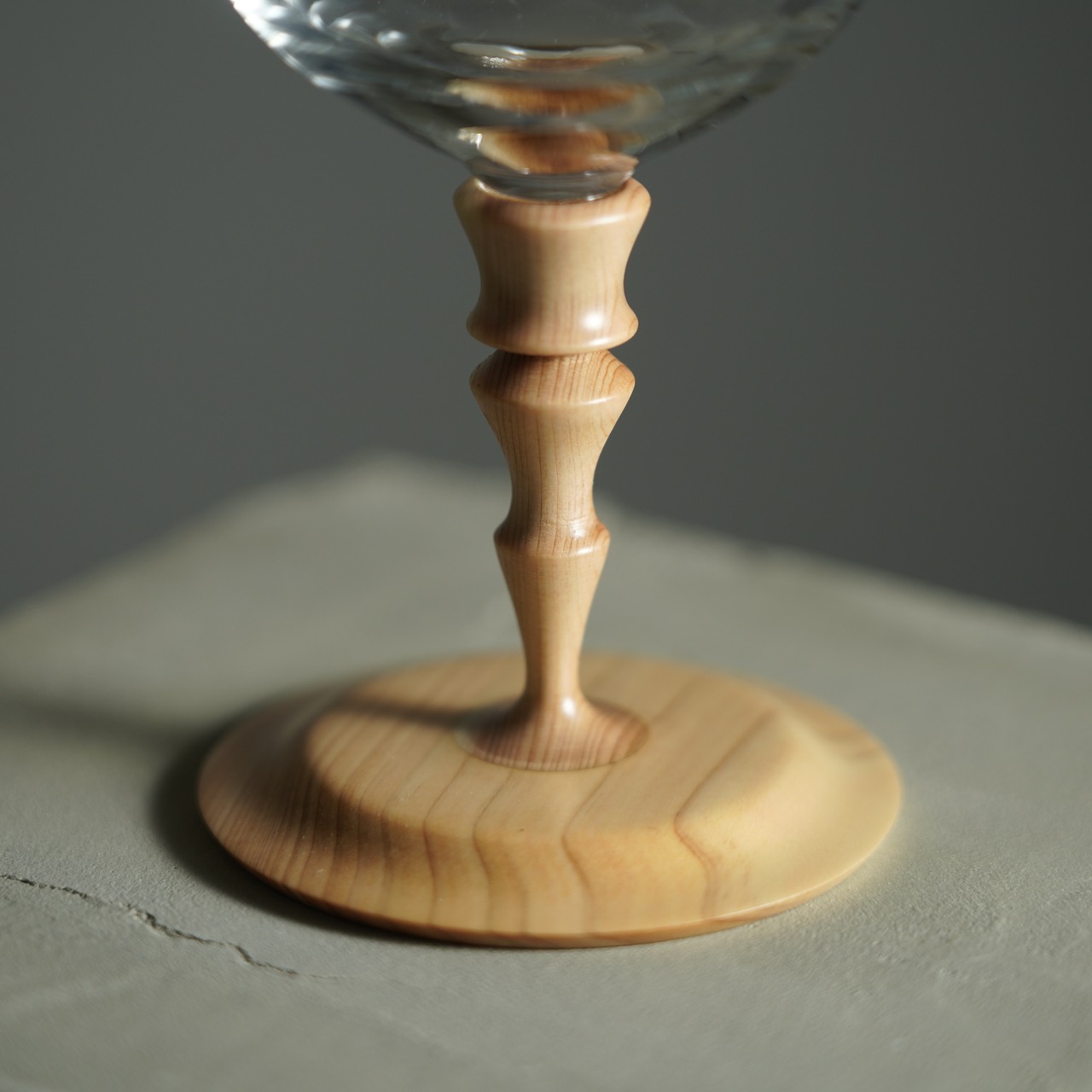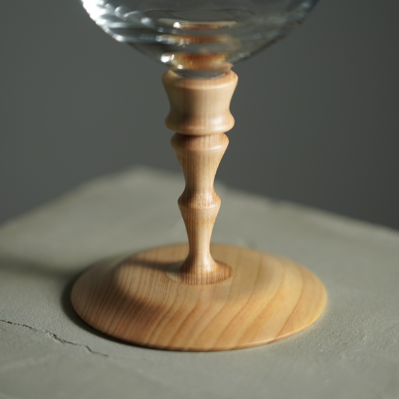 木と硝子の沐器『MOKU glass』の最大の特徴は、持ち手の部分(ステム)と土台(プレート)が木製であることです。