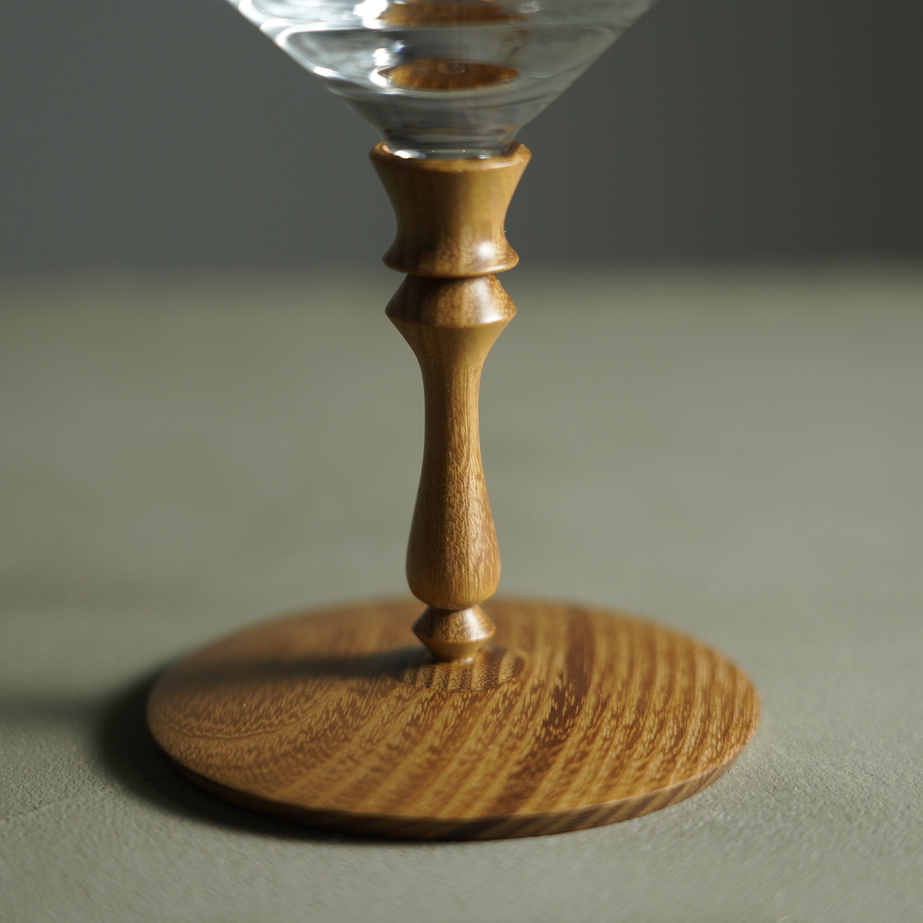 木と硝子の沐器『MOKU glass』の最大の特徴は、持ち手の部分(ステム)と土台(プレート)が木製であることです。